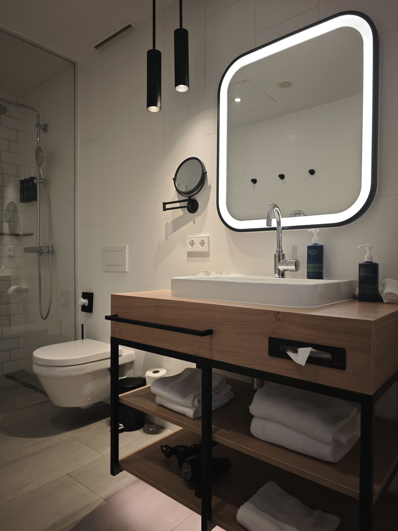 It is very modern and also here an amazing light concept with modern lights and what I loved, finally a hotel in Europe who offers some night lights if you have to use the restroom. Very well